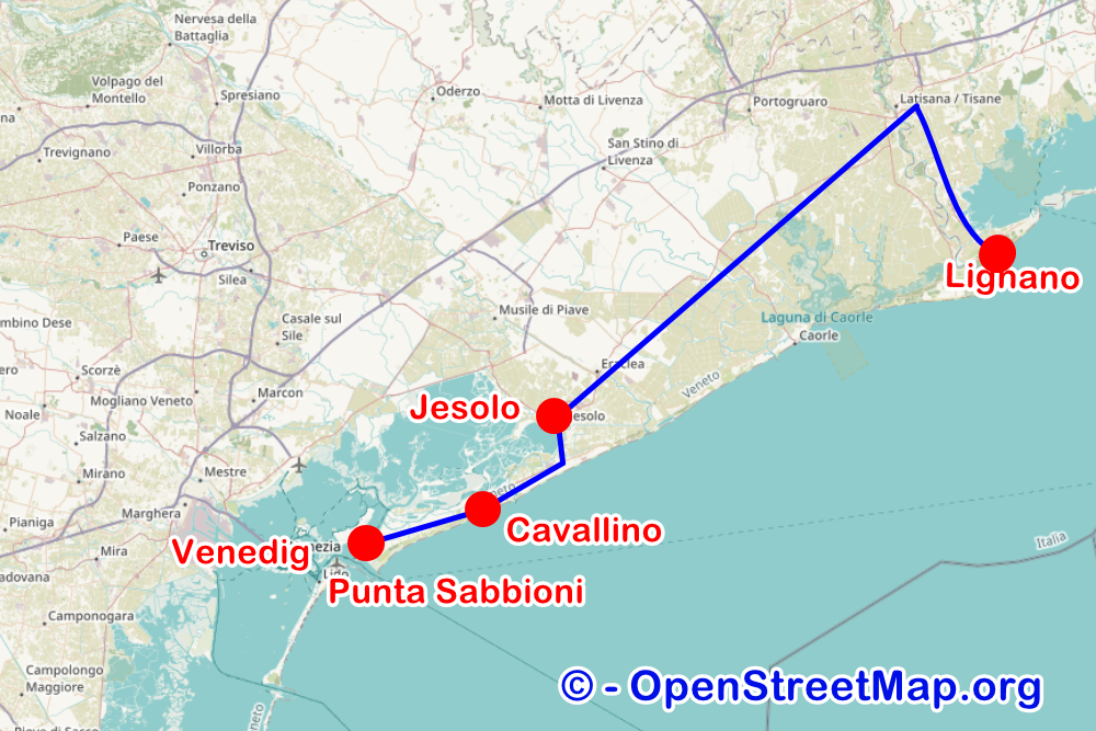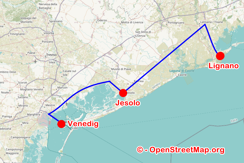 Die Route geht von Lignano Richtung Venezia, am Flugplatz Marco Polo von Venedig vorbei, durch Mestre, über die 4 km lange und einen Meter hohe Brücke, zum nördlichen Stadtrand dem Piazzale Roma (P.le Roma) mit den 3 großen Parkhäusern.