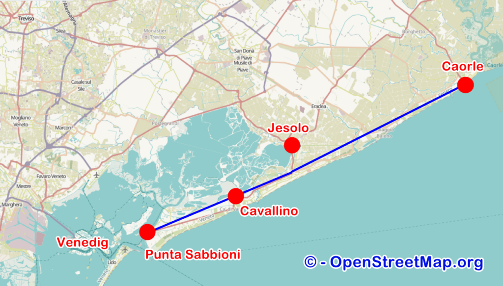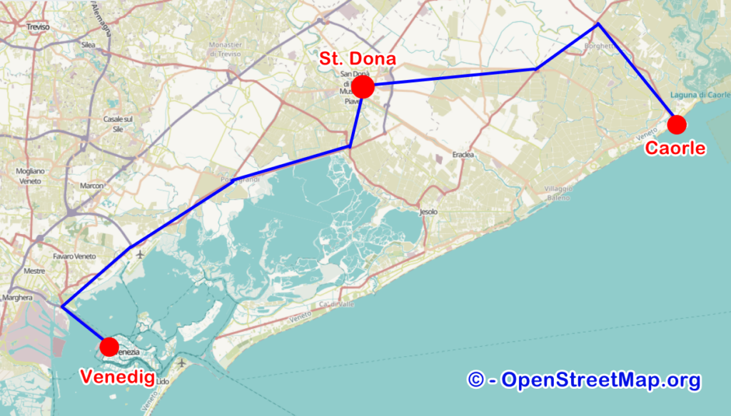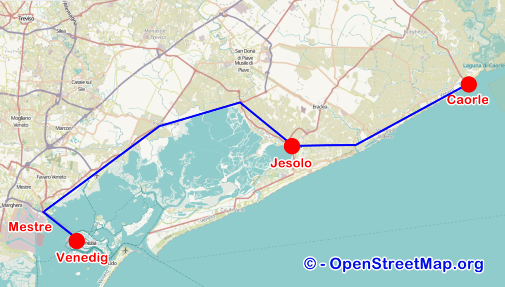 Die Route geht von Caorle Richtung Venezia, am Flugplatz Marco Polo von Venedig vorbei, durch Mestre, über die 4 km lange und einen Meter hohe Brücke, zum nördlichen Stadtrand dem Piazzale Roma (P.le Roma) mit den 3 großen Parkhäusern.