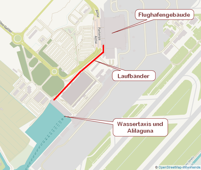 Der Flughafen Marco Polo wurde in den letzten Jahren immer weiter ausgebaut und modernisiert. Mittlerweile stehen Ihnen für den Weg vom Flughafengebäude zur Anlegestelle der Wassertaxis bzw. den Booten der Ali Laguna und zurück, in jeder Richtung waagerechte Laufbänder zur Verfügung.