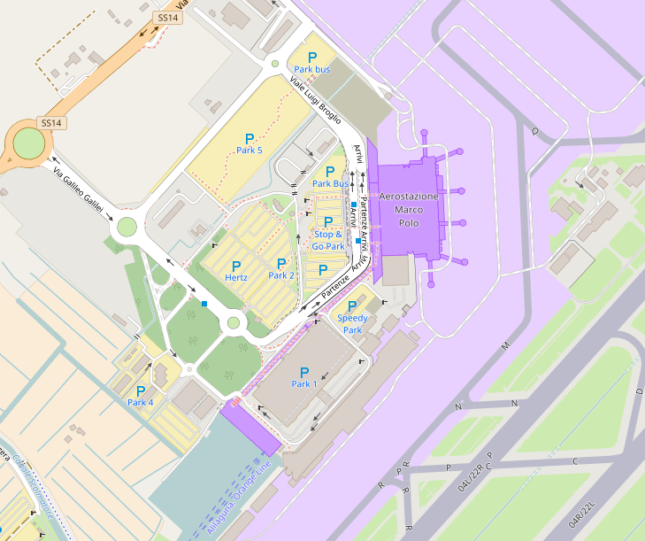 Wie so üblich, befinden sich zusätzlich zum Flughafengebäude und der Start- und Landebahn auch mehrere große Parkplätze auf dem Gelände des Flughafens. Diese Parkplätze haben für Sie als Venedig Tourist keine größere Bedeutung.