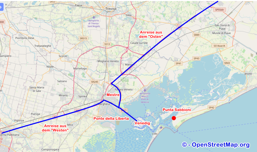 Entweder Sie kommen „aus dem Westen“ aus Richtung Verona, z.B. von der Brennerautobahn, oder „aus dem Osten“ vom Grenzübergang Villach-Tarvisio. Bei Mestre verlassen Sie die Autobahn und fahren weiter nach Venedig (Venezia).