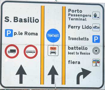 Am Ende der 4 km langen Brücke, macht die Strasse eine leichte Biegung nach rechts. Hier wird die Strasse auch breiter und 3 spurig. Die linke Spur geht geradeaus zu den bewachten Parkhäusern am Piazzale Roma, die rechte Spur biegt ab zum unbewachten Parkhaus Tronchetto bzw. zur Fähre zum Lido. Jetzt müssen Sie sich entscheiden, wo Sie parken werden.