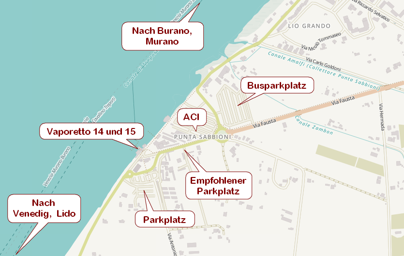 Sie erfahren hier alles Wissenswerte der Anreise über Punta Sabbioni: Parkplätze, Vaporetti, Busbahnhof, etc.