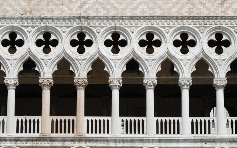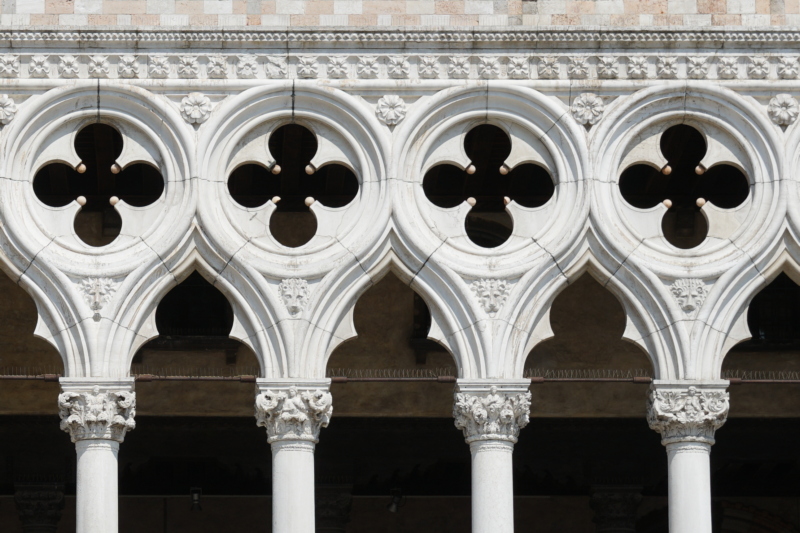 Dieses Motiv ist ein 4 blättriges Kleeblattmotiv. Es wurde in der Gotik recht oft verwendet. Beim Dogenpalast taucht es im 14. Jahrhundert auf, und wurde ein Trendsetter für Venedig, denn schließlich ist ja der Dogenpalast der Sitz der Regierung. Viele Adelsfamilien nahmen sich das zum Vorbild.