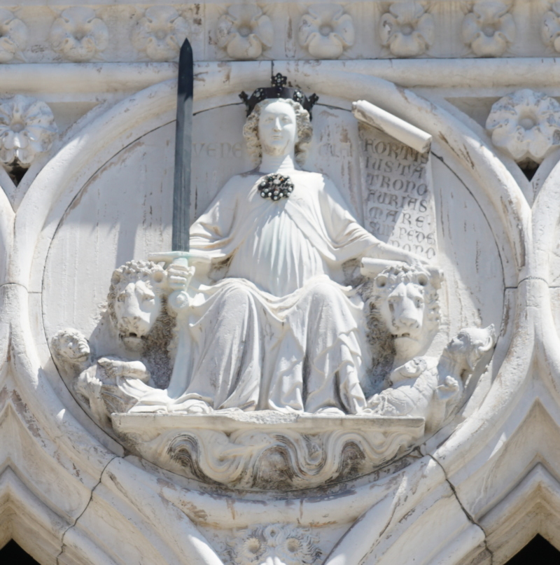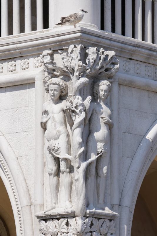 Auch hier geht fast jeder achtlos vorbei: Direkt am Eckpfeiler des Dogenpalastes, zwischen der Südseite an der Lagune und den beiden Säulen an der Piazetta, sehen Sie diese Figur.