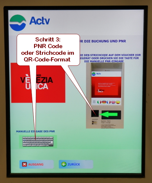 Jetzt müssen Sie sich entscheiden ob Sie im Display, das Symbol für eine Computer Tastatur drücken (links unten im Bild), um den PNR Code, der auf Ihrem Voucher steht einzugeben, oder ob Sie den Strichcode im QR Code Format an den Scanner unterhalb des Displays halten.