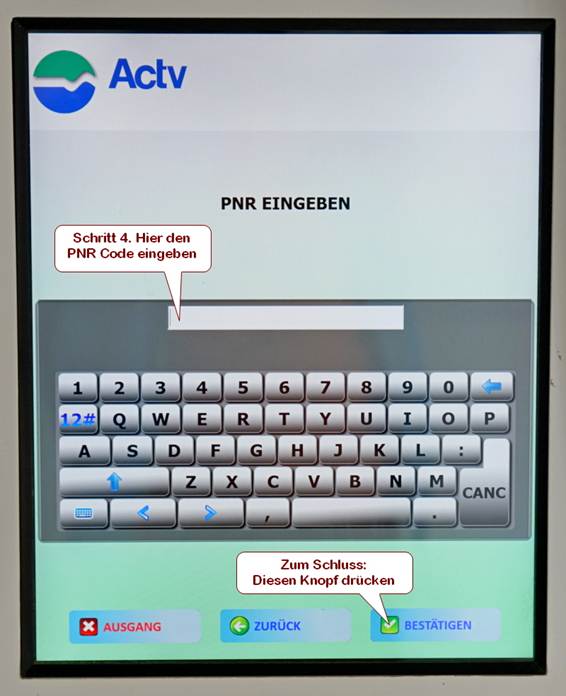 Falls Sie den Scanner des QR Code NICHT benutzen wollen, geben Sie den PNR Code, den Sie per eMail von uns erhalten, jetzt am Display ein. Selbst wenn Sie zum ersten Mal den Ticket Automaten bedienen, sind Sie in 15 Sekunden fertig und haben Ihr Ticket.