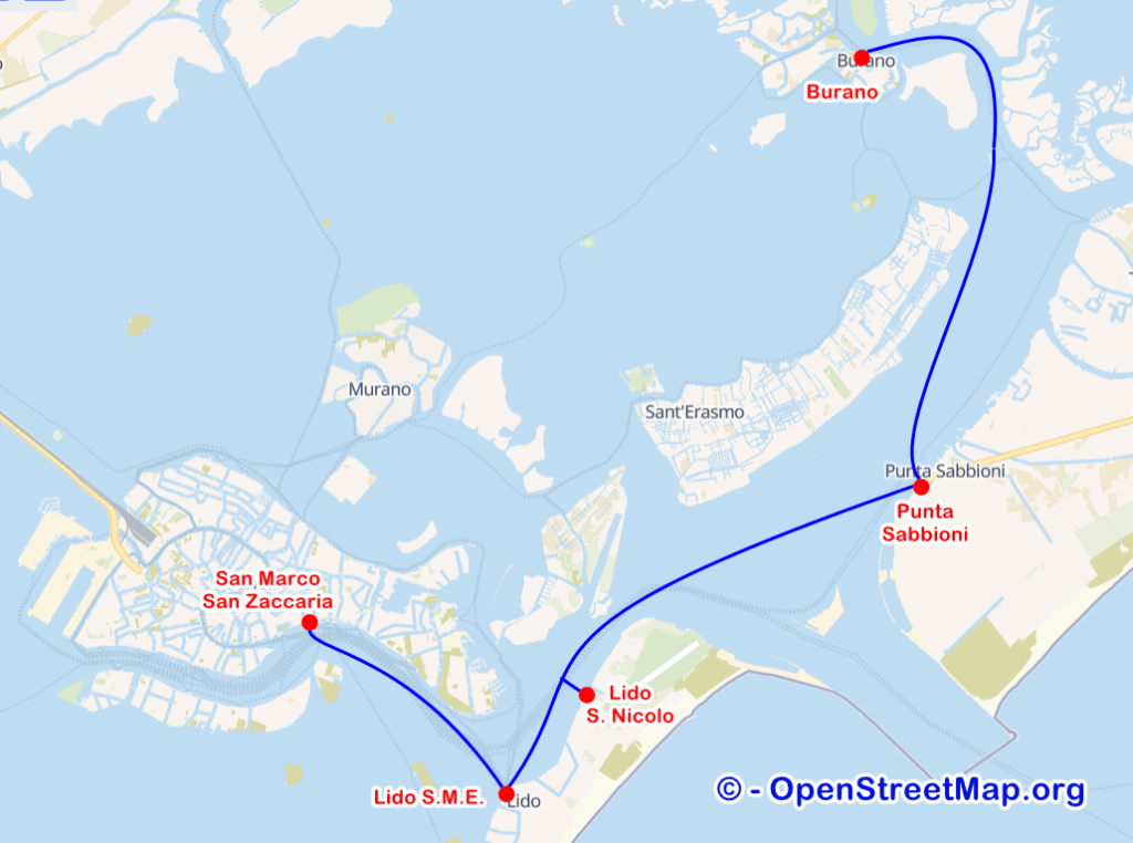 Markusplatz – Piazzale Roma – Bahnhof (Ferrovia) – Parkinsel Tronchetto – Rialtobrücke – Lido – Murano – Burano – Punta Sabbioni