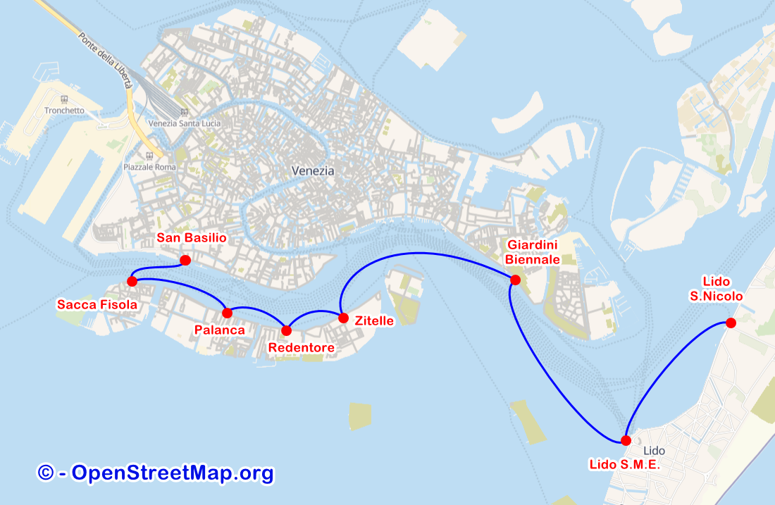 Markusplatz – Piazzale Roma – Bahnhof (Ferrovia) – Parkinsel Tronchetto – Rialtobrücke – Lido – Murano – Burano – Punta Sabbioni