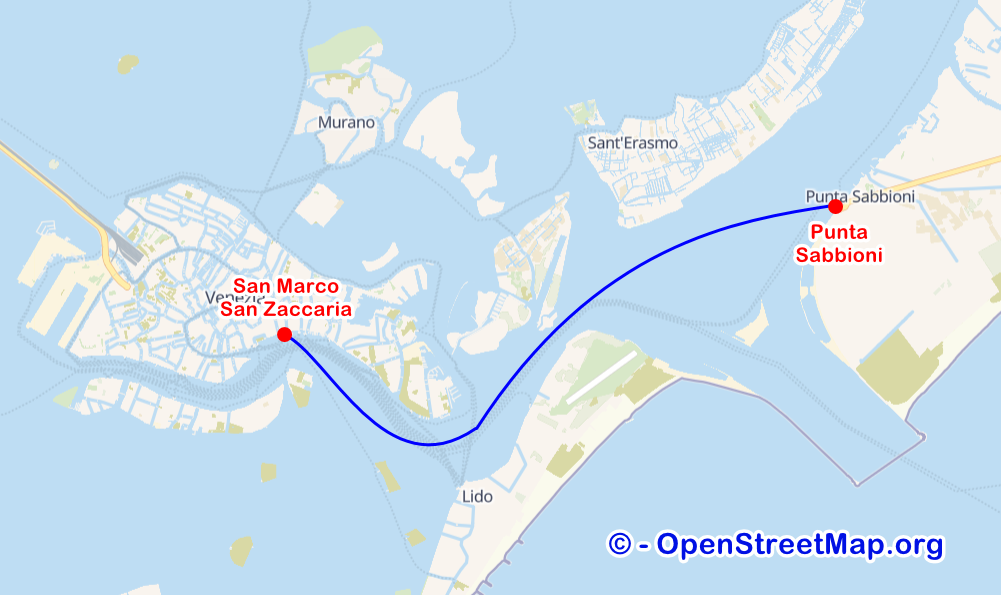 Markusplatz – Piazzale Roma – Bahnhof (Ferrovia) – Parkinsel Tronchetto – Rialtobrücke – Lido – Murano – Burano – Punta Sabbioni
