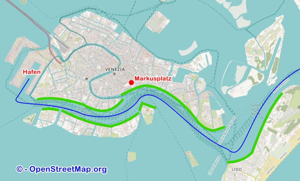 Im Plan. Die blaue Linie ist die Route der Schiffe von der Lagune bis in den Hafen. Die dicke grüne Linie ist der durchgängige Uferweg (Fondamente) der die Häuser schützt.