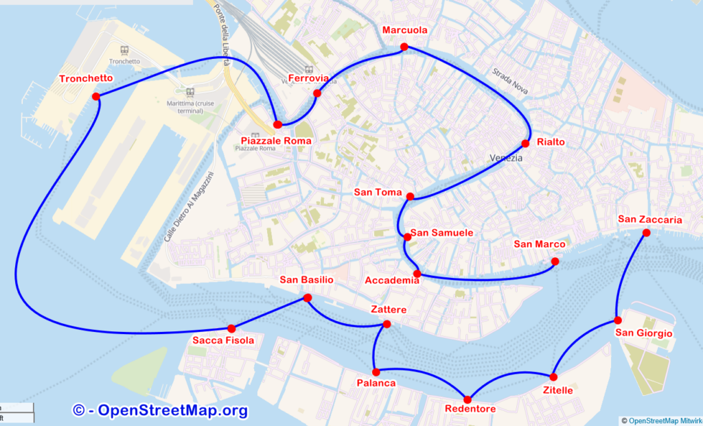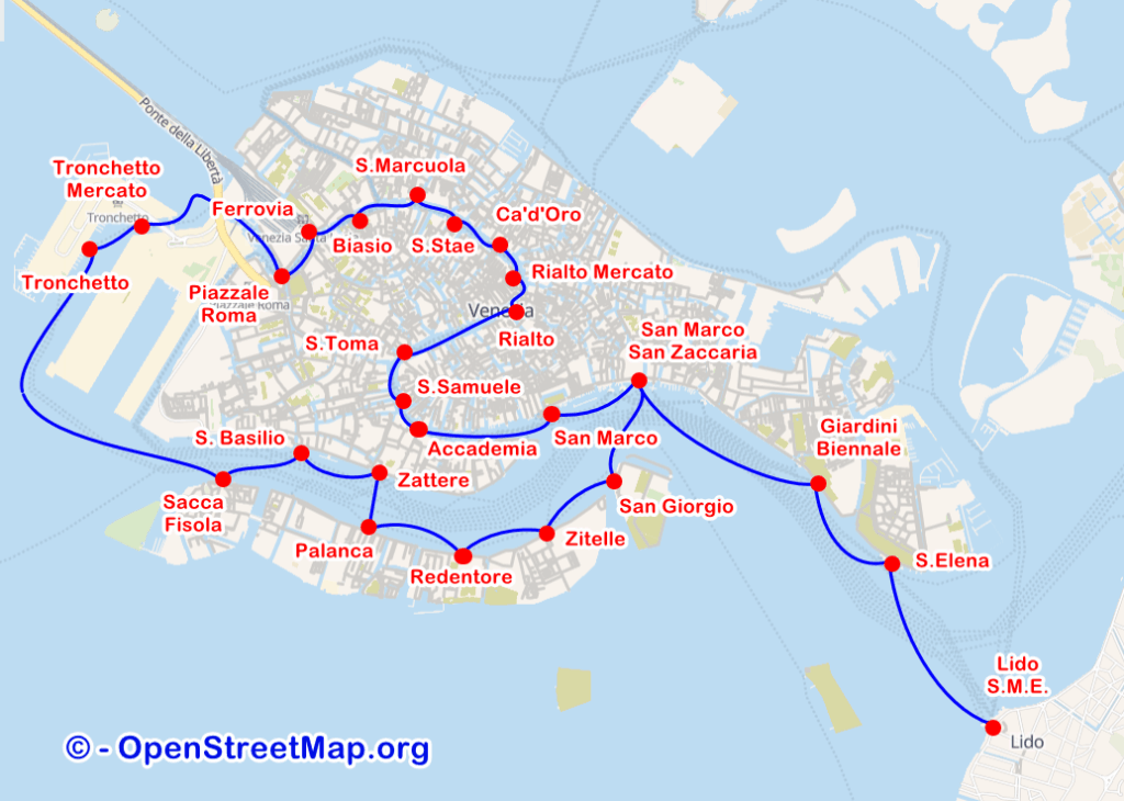 Markusplatz – Piazzale Roma – Bahnhof (Ferrovia) – Parkinsel Tronchetto – Rialtobrücke – Lido – Murano – Burano – Punta Sabbioni